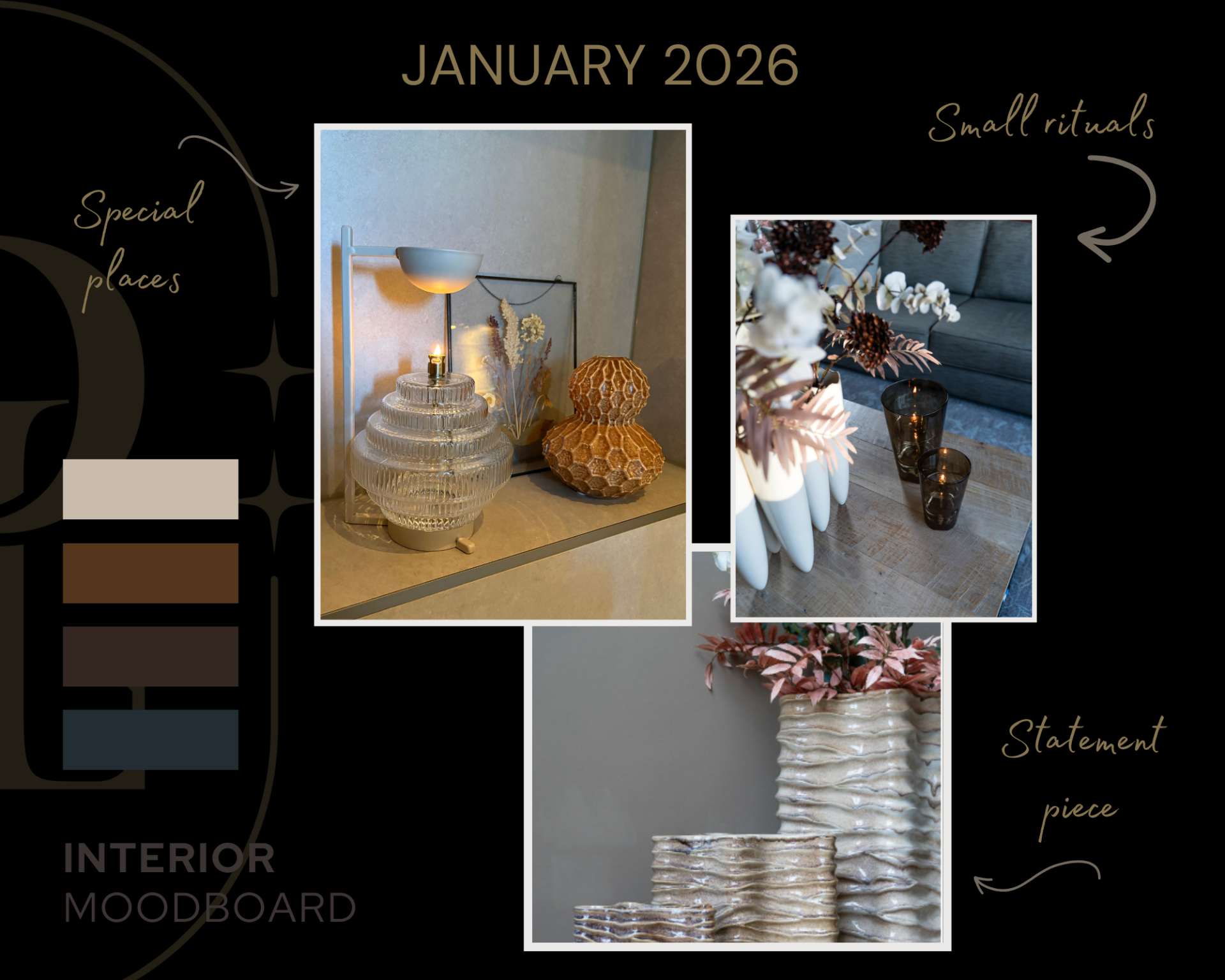 A small setting that invites a moment of pause. A corner that subtly draws customers in as they enter. It doesn’t have to be a grand gesture. It can be a shelf. A niche. A section of wall that has always felt like “nothing”. That is exactly the place to introduce something unique. To support this gentle restart in the interior, we choose colours in January that bring warmth and simplicity. Tones that don’t compete with brass, glass and ceramic, but enhance them.