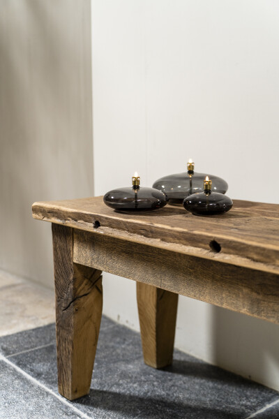 Measuring Ø14 × 6 cm, this medium-sized oil lamp is ideal as a stylish centerpiece on a dining table, a subtle highlight in shop displays, or as part of a layered interior arrangement. The smoked brass surface creates depth and warmth, making the flame glow with a soft and inviting radiance.