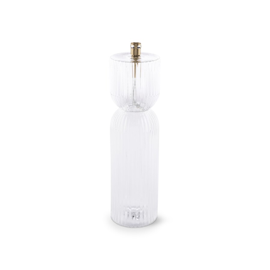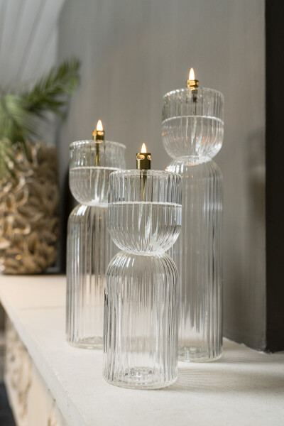 Oil lamp Ribelle Clear Brass M is an elegant oil lamp made of clear glass with a subtle ribbed pattern and a brass-coloured wick holder. Its slim, tall design radiates timeless refinement, while the glass beautifully enhances the warm glow of the flame.