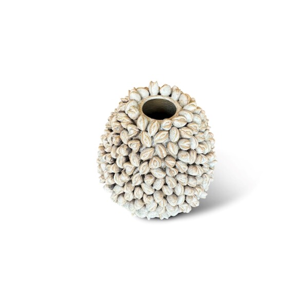 The Pistachio L is a distinctive ceramic vase with a detailed relief reminiscent of pistachio shells or natural seed pods. Its soft beige finish enhances the organic character and brings a warm touch, making it perfect for autumn and winter styling. With a size of 34 x 34 x 34 cm, this vase is ideal for arranging with winter greenery, decorative branches or silk flowers. A unique eye-catcher, directly available to enrich your interior with texture and elegance.