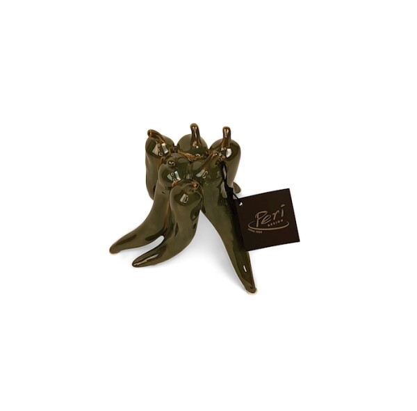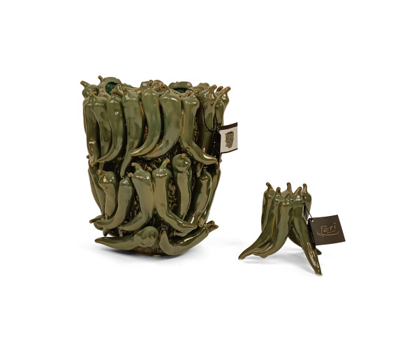 Le vase Chili Green XS est un vase en céramique fait main depuis les Pays-Bas, de création propre, en forme de piment dans un vert brillant. La forme reconnaissable et la couleur vivante en font un attrait direct sur un comptoir ou en vitrine d'un concept store qui ose surprendre. Un sujet de conversation qui fait s'arrêter les clients et sourire, fort comme article cadeau et comme accent solitaire dans une présentation colorée.