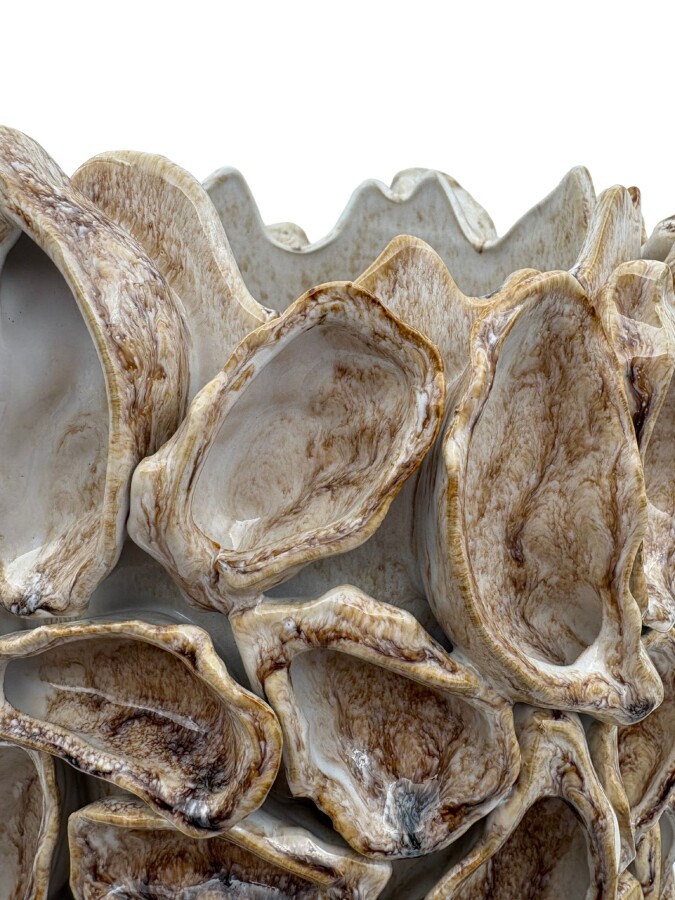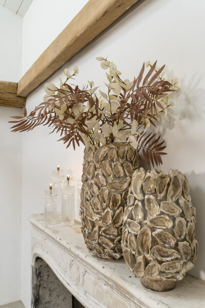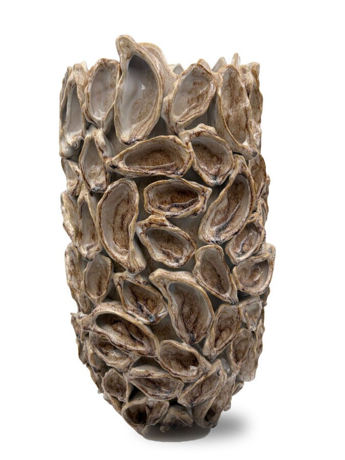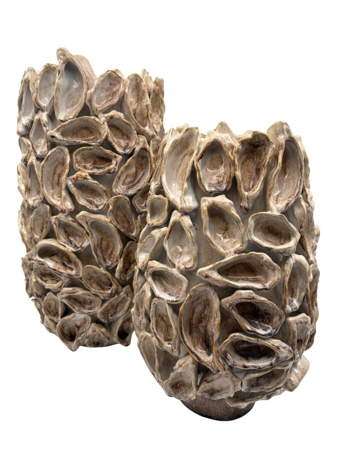 Le vase Living Oyster Beige L est un vase en céramique fait main depuis les Pays-Bas, de création propre, à la structure en relief d'huître dans une teinte beige douce. Le grand format et la structure en relief organique en font un statement qui attire l'attention dans un magasin d'intérieur haut de gamme ou un concept store. Convient aux compositions florales et aux branches. À combiner avec le format M.