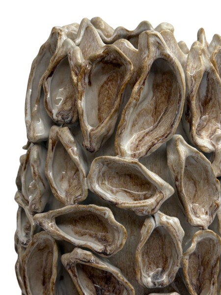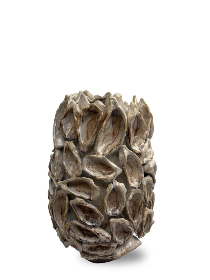 Le vase Living Oyster Beige M est un vase en céramique fait main depuis les Pays-Bas, de création propre, à la structure en relief d'huître dans une teinte beige douce. La texture organique et la couleur neutre lui confèrent un caractère naturel et accessible qui dégage immédiatement de la sérénité dans une vitrine de fleuriste ou une présentation d'intérieur Japandi. Convient aux petites compositions florales et comme objet sculptural. À combiner avec le format L.