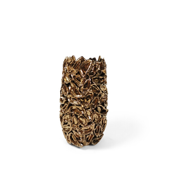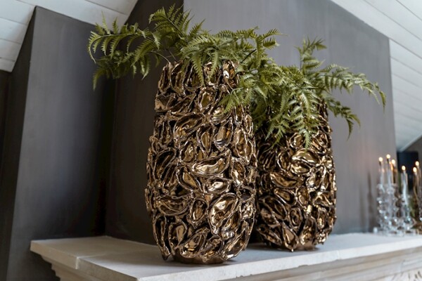 Le vase Living Oyster L est un vase en céramique fait main depuis les Pays-Bas, de création propre, à la structure en relief d'huître dans un bronze brillant. Le grand format et la texture riche en font un attrait visuel puissant en vitrine, dans un lobby d'hôtel ou un concept store prenant la nature et le luxe comme point de départ. Convient aux compositions florales et aux branches. À combiner avec le format M.