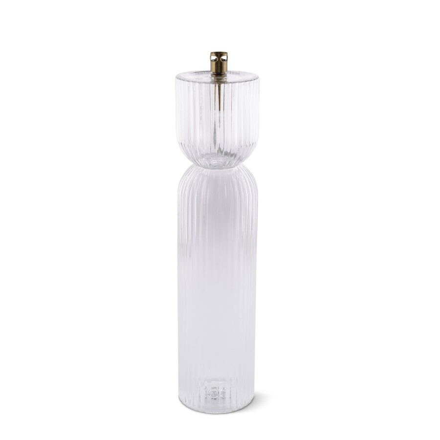 La Ribelle Clear Brass L est une lampe à huile en verre soufflé à la main depuis les Pays-Bas, à la structure nervurée en verre transparent et aux détails en laiton. En lumière directe, le verre nervuré décompose la lumière en arcs-en-ciel qui se déplacent sur les murs. Brûle sans fumée ni odeur avec l'huile de paraffine Peri Living, avec une mèche en fibre de verre. À associer aux formats S et M.