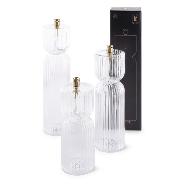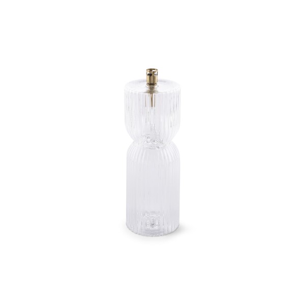 La Ribelle Clear Brass S est une lampe à huile en verre soufflé à la main depuis les Pays-Bas, à la structure nervurée élancée en verre transparent et aux détails en laiton. Les nervures brisent la lumière d'une façon qu'une bougie ordinaire ne peut reproduire : la flamme danse visiblement à travers le verre et donne du caractère à n'importe quel espace. Brûle sans fumée ni odeur avec l'huile de paraffine Peri Living, avec une mèche en fibre de verre. À associer aux formats M et L.