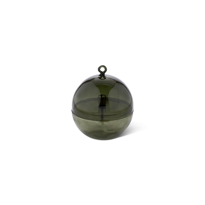 La Round Cover Green Brass L est une lampe à huile en verre soufflé à la main depuis les Pays-Bas, à la forme ronde en verre vert millennial avec couvercle et aux détails en laiton. Le grand format et la teinte verte fraîche en font un attrait estival en vitrine de jardin. Le couvercle le rend pratique et transportable. Brûle sans fumée ni odeur avec l'huile de paraffine Peri Living, avec une mèche en fibre de verre.