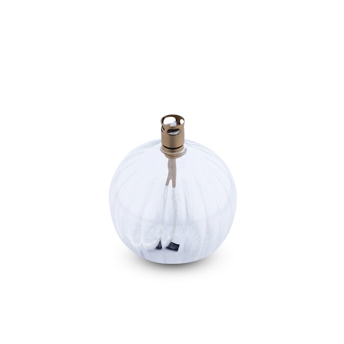La Round Elegant Brass S est une lampe à huile en verre soufflé à la main depuis les Pays-Bas, à la forme ronde en verre ondulé nervuré et aux détails en laiton. Au soleil du matin, le verre décompose la lumière en arcs-en-ciel doux qui se déplacent sur une nappe ou un mur. Sur un plateau avec un café et un journal, sur un rebord de fenêtre ou comme accent discret dans une vitrine de fleuriste. Brûle sans fumée ni odeur avec l'huile de paraffine Peri Living, avec une mèche en fibre de verre. À combiner avec les formats M et L.