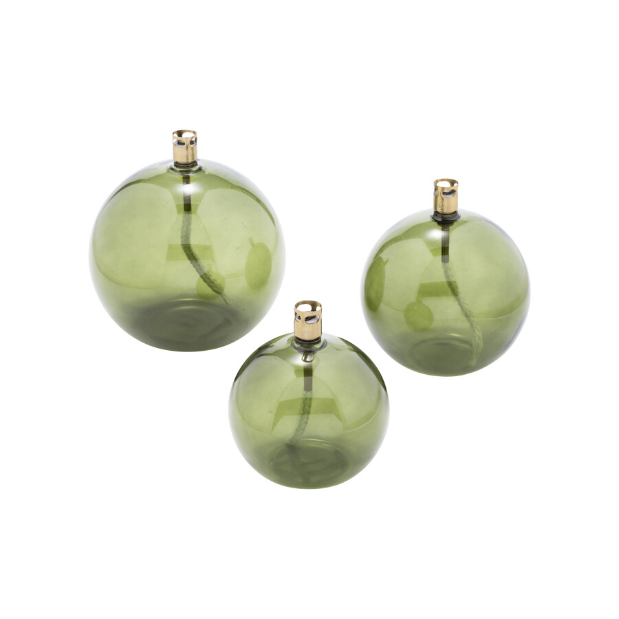 La Round Green Brass S est une lampe à huile en verre soufflé à la main depuis les Pays-Bas, à la forme ronde en verre vert et aux détails en laiton. La teinte verte fraîche s'intègre naturellement parmi les plantes, sur une étagère dans une serre ou entre des plantes grasses sur un rebord de fenêtre. Brûle sans fumée ni odeur avec l'huile de paraffine Peri Living, avec une mèche en fibre de verre. À combiner avec les formats M et L.