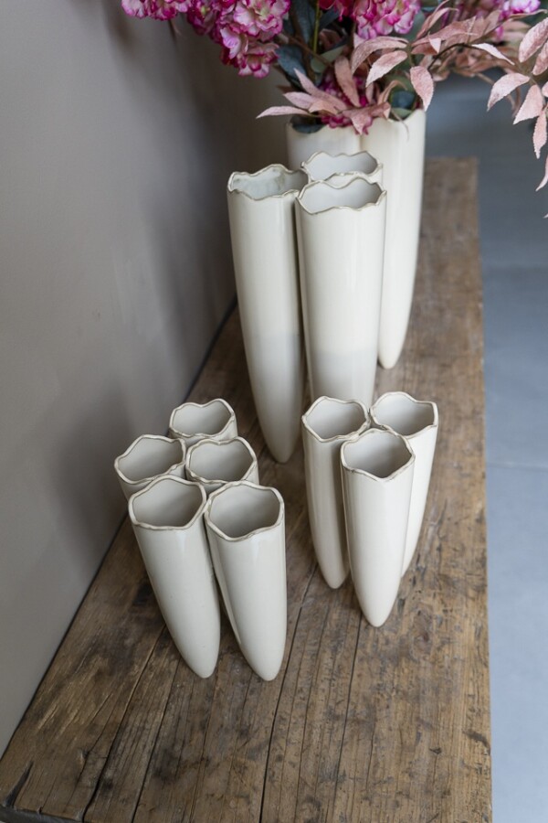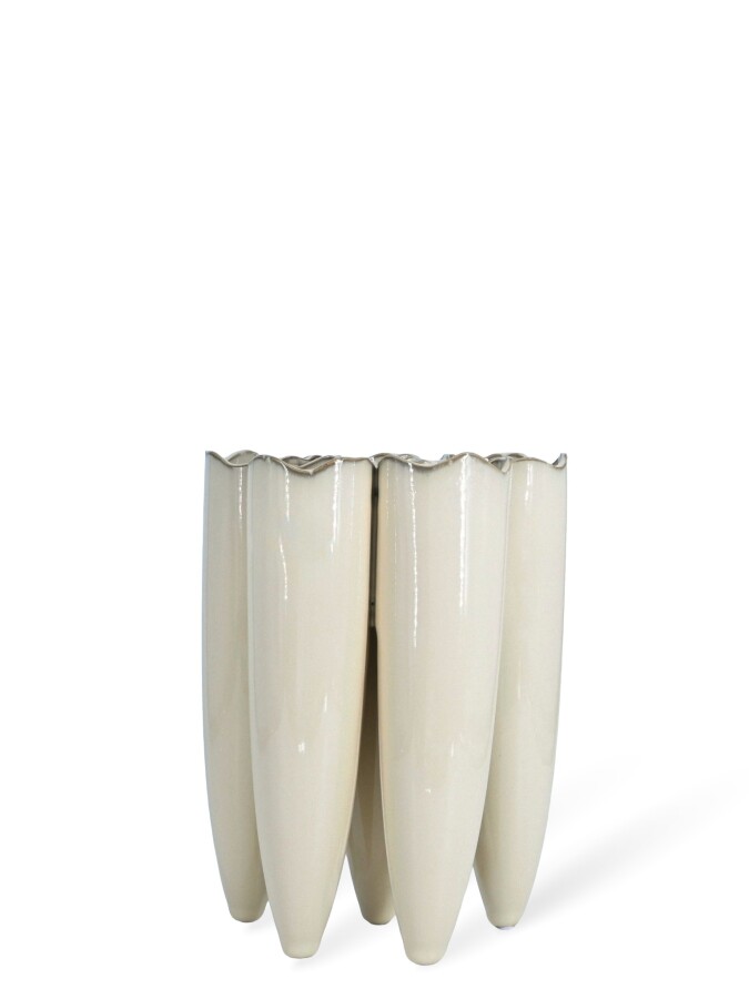 Le vase Serak XL est un vase en céramique fait main depuis les Pays-Bas, de création propre, à la forme sculpturale élancée et à la structure de lignes verticales. Le format extra-large en fait un attrait visuel puissant dans un lobby d'hôtel ou un magasin d'intérieur haut de gamme. Convient aux longues branches et grandes compositions florales. À combiner avec les formats M, L et XXL.