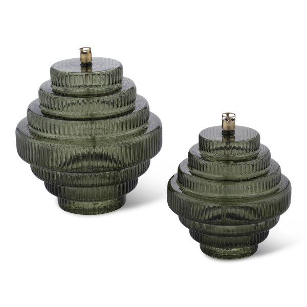La Twin Green Brass L est une lampe à huile en verre soufflé à la main depuis les Pays-Bas, à la structure nervurée horizontale en couches rondes en verre vert et aux détails en laiton. Le grand format et la teinte verte délibérée en font un objet de design qui revendique son espace, ancre sculpturale sur une table BBQ haut de gamme ou statement dans un magasin d'intérieur. Brûle sans fumée ni odeur avec l'huile de paraffine Peri Living, avec une mèche en fibre de verre. À combiner avec le format M.