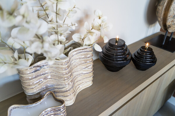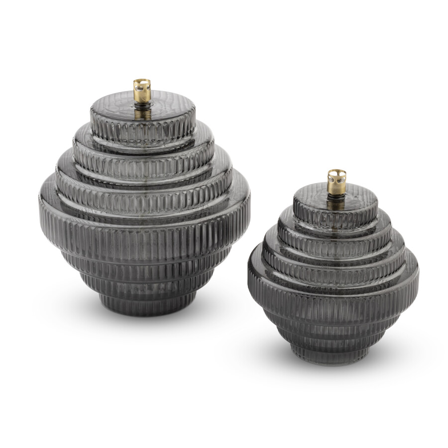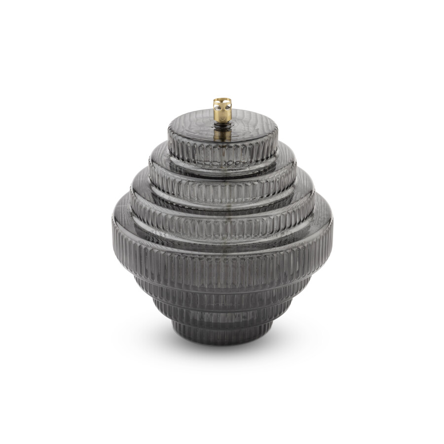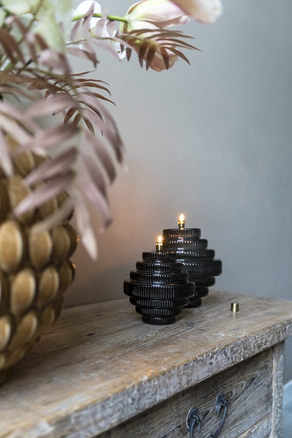 La Twin Smoked Brass L est une lampe à huile en verre soufflé à la main depuis les Pays-Bas, à la structure nervurée horizontale en couches rondes en verre smoked et aux détails en laiton. Le grand format et la teinte smoked profonde en font le statement le plus fort de la série Twin, objet de design sculptural dans un magasin d'intérieur haut de gamme. Brûle sans fumée ni odeur avec l'huile de paraffine Peri Living, avec une mèche en fibre de verre. À combiner avec le format M.