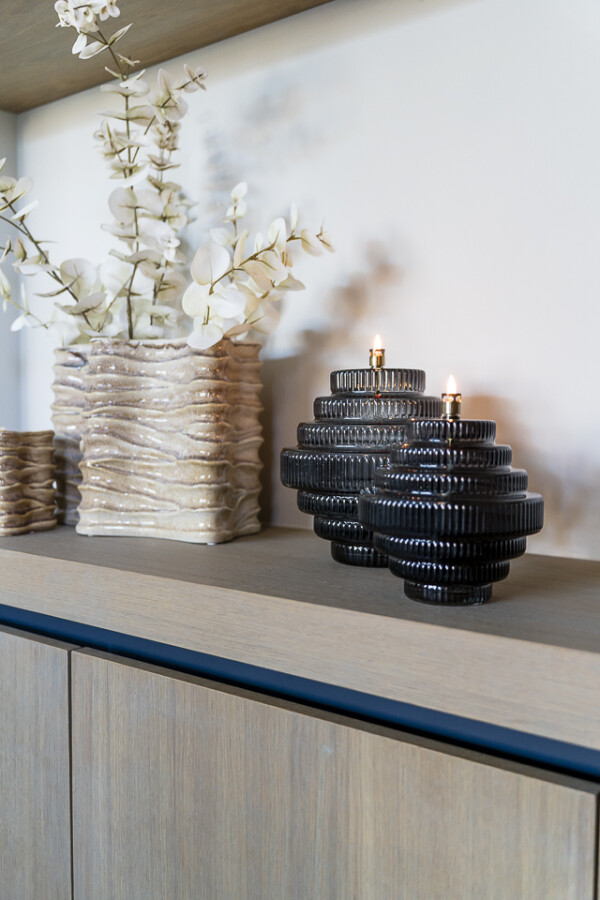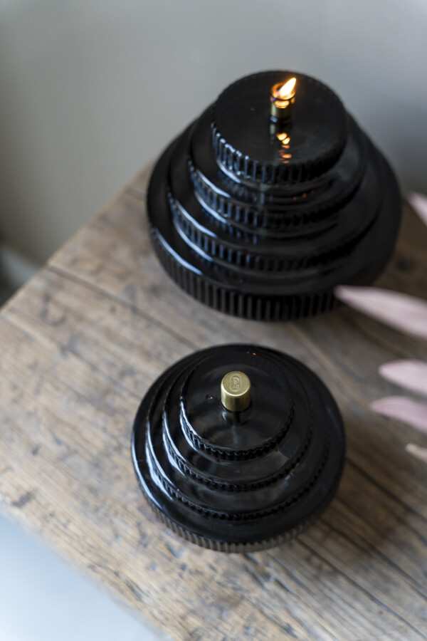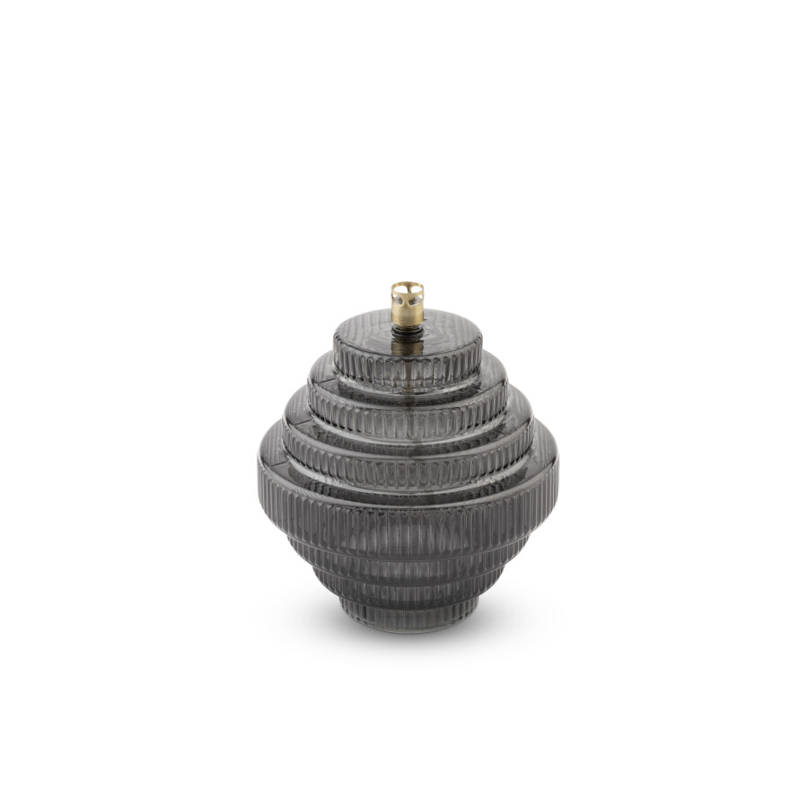 La Twin Smoked Brass M est une lampe à huile en verre soufflé à la main depuis les Pays-Bas, à la structure nervurée horizontale en couches rondes en verre smoked et aux détails en laiton. La teinte smoked feutrée donne à la forme sculpturale Art déco un caractère sombre et dramatique adapté aux intérieurs haut de gamme qui n'ont pas peur de la profondeur. Brûle sans fumée ni odeur avec l'huile de paraffine Peri Living, avec une mèche en fibre de verre. À combiner avec le format L.