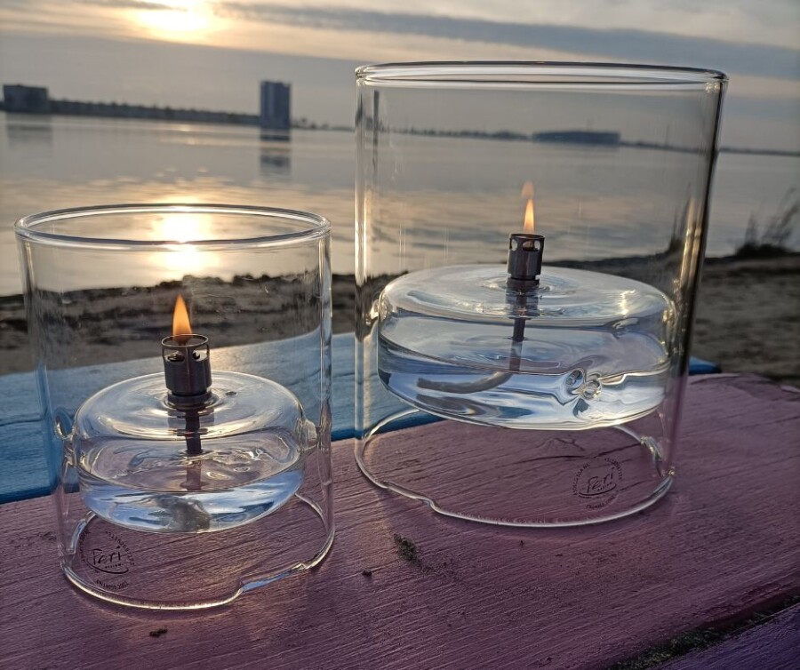 La Windshelter Disc Clear Chrome M est une lampe à huile en verre soufflé à la main de 20 x 14 cm depuis les Pays-Bas, à construction disque coupe-vent en verre transparent et au brûleur chrome. La construction fermée protège la flamme du vent, ce qui permet à cette lampe de rester allumée en extérieur là où d'autres s'éteignent. La forme disque épurée et le chrome frais conviennent aux terrasses modernes, aux hôtels design ou aux établissements qui évitent les tons dorés. Brûle sans fumée ni odeur avec l'huile de paraffine Peri Living, avec une mèche en fibre de verre.