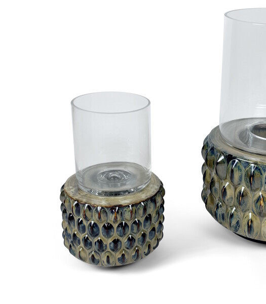 De Ocean Glow M is een compact windlicht met een keramieken basis in oceaanstructuur en een helder glazen cilinder. Met zijn formaat van 17 cm hoog is dit design ideaal om sfeervol licht te verspreiden op tafel, dressoir of vensterbank.